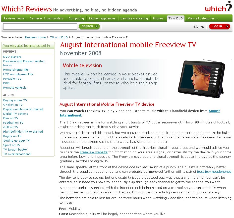August DTV350C, a 3.5" mini handheld Freeview TV with built-in card reader and USB port, has been tested, reviewed and recommended by the UK's most trustworthy magazine providing independent expert advice to good and no-good goods in November 2008. This mobile TV can be carried in your pocket or bag, and is able to receive Freeview channels. It might be ideal for football fans, or those who love their soap operas, the magazine highlighted the features of DTV350C.